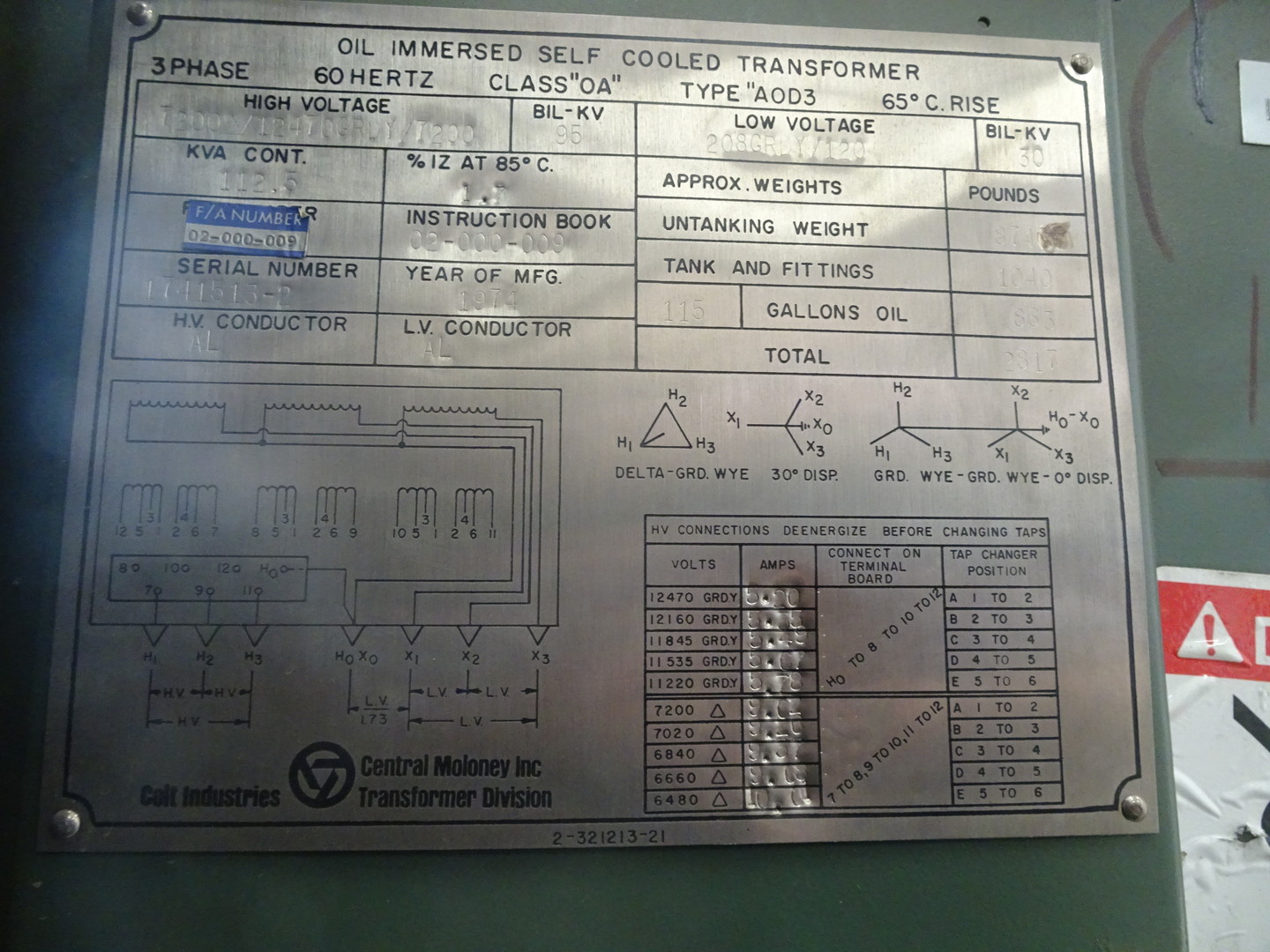 | Voltages | Pri-Voltage : 7200 DELTA X 12470Y/7200 | Sec Voltage : 208Y/120 | Taps : W/Taps 4 X 2 1/2% Below | |