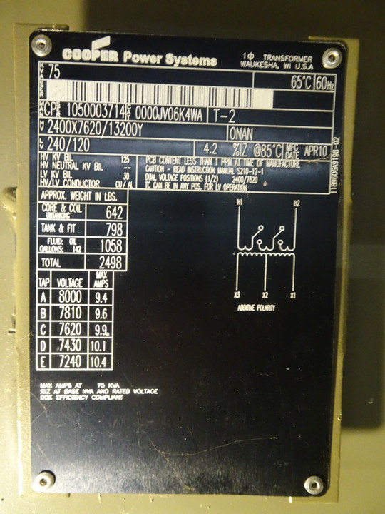 | Voltages | Pri-Voltage : 2400 DELTA X 13200Y/7620 | Sec Voltage : 240/120 | Taps : With Taps 2x2.5% Above and Below | |